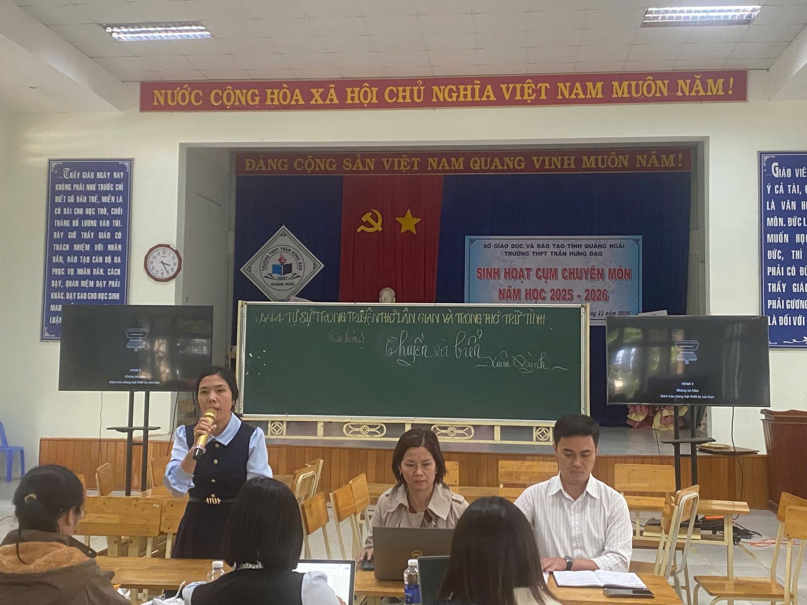 Chiều ngày 27/11/2025, tại Hội trường Trường THPT Trần Hưng Đạo, Cụm chuyên môn Ngữ văn số 4 đã tổ chức Hội thảo chuyên đề với mục tiêu nghiên cứu và đổi mới phương pháp dạy học thể loại thơ theo đặc trưng thể loại, đặc biệt là yếu tố tự sự trong thơ trữ tình. Chuyên đề nhằm đáp ứng yêu cầu dạy học bài “Thuyền và biển” (Xuân Quỳnh) thuộc chương trình Ngữ văn 11 – Bộ sách Kết nối tri thức với đời sống, đồng thời tạo diễn đàn để giáo viên trao đổi, chia sẻ kinh nghiệm giảng dạy tác phẩm thơ có yếu tố tự sự trong nhà trường THPT.