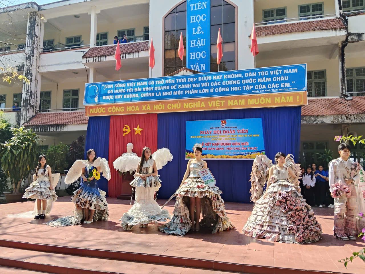 Ngay sau đó, sân trường như “nóng lên” với hàng loạt trò chơi tập thể hấp dẫn. Trò chơi “Thượng đế phán” đã mang đến những tràng cười sảng khoái, đồng thời thể hiện sự nhanh nhạy, tinh thần phối hợp ăn ý và đoàn kết của các tập thể lớp. Không khí càng trở nên đặc biệt khi cuộc thi thiết kế trang phục từ rác thải tái chế diễn ra đầy sáng tạo. Những bộ trang phục độc đáo không chỉ gây ấn tượng mạnh về thẩm mỹ mà còn gửi gắm thông điệp sâu sắc về bảo vệ môi trường, xây dựng lối sống xanh, góp phần hướng tới một môi trường học đường văn minh, thân thiện.